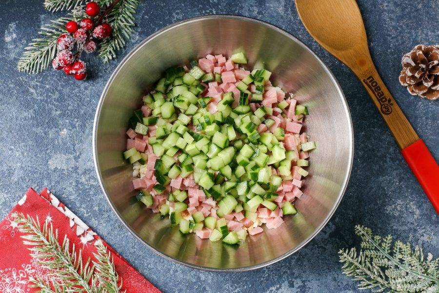 Огурец нарежьте примерно такими же кубиками.