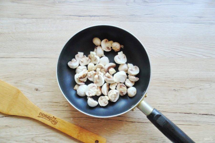 Шампиньоны очистите, нарежьте и выложите в сковороду с рафинированным подсолнечным маслом. Обжарьте грибы.