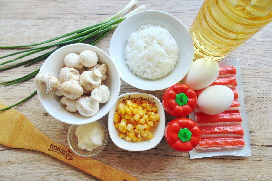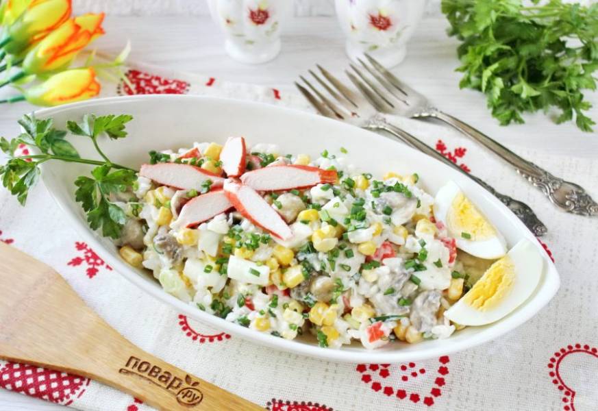Сегодня хочу предложить вам очень интересный салат, в котором хорошо сочетаются жареные шампиньоны и крабовые палочки. Отварной рис и яйца придают блюду сытость. Отличная закуска в будни и праздники!