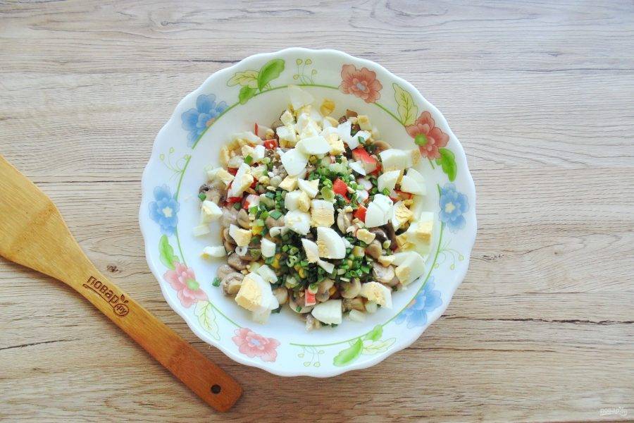 Яйца сварите вкрутую, охладите и очистите. Лук зеленый помойте. Мелко нарежьте яйца и зеленый лук.