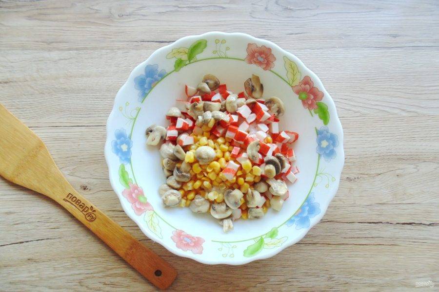 Добавьте консервированную кукурузу и нарезанные крабовые палочки.