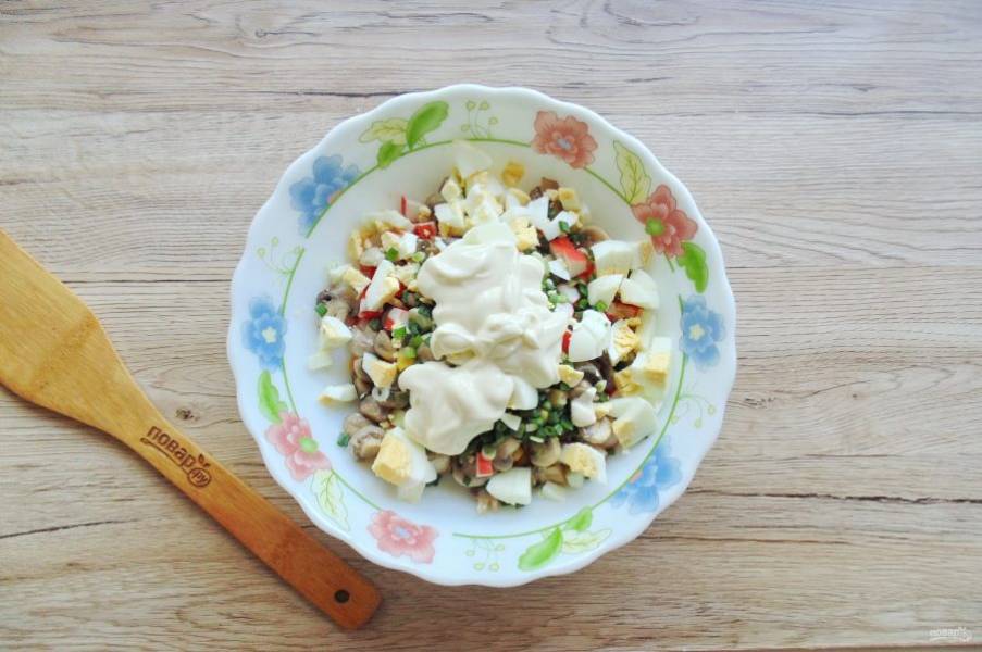Салат посолите, поперчите по вкусу и заправьте майонезом.