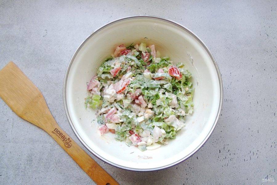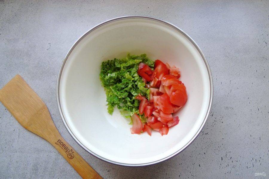 Пекинскую капусту и помидор нарежьте, выложите в миску.