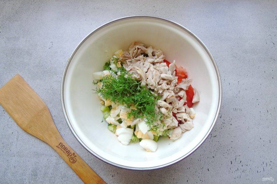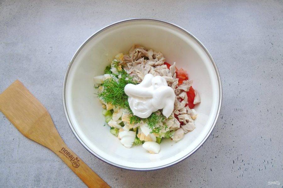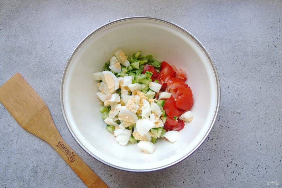 Яйца сварите вкрутую, охладите, очистите и мелко нарежьте. Огурец также мелко нарежьте.
