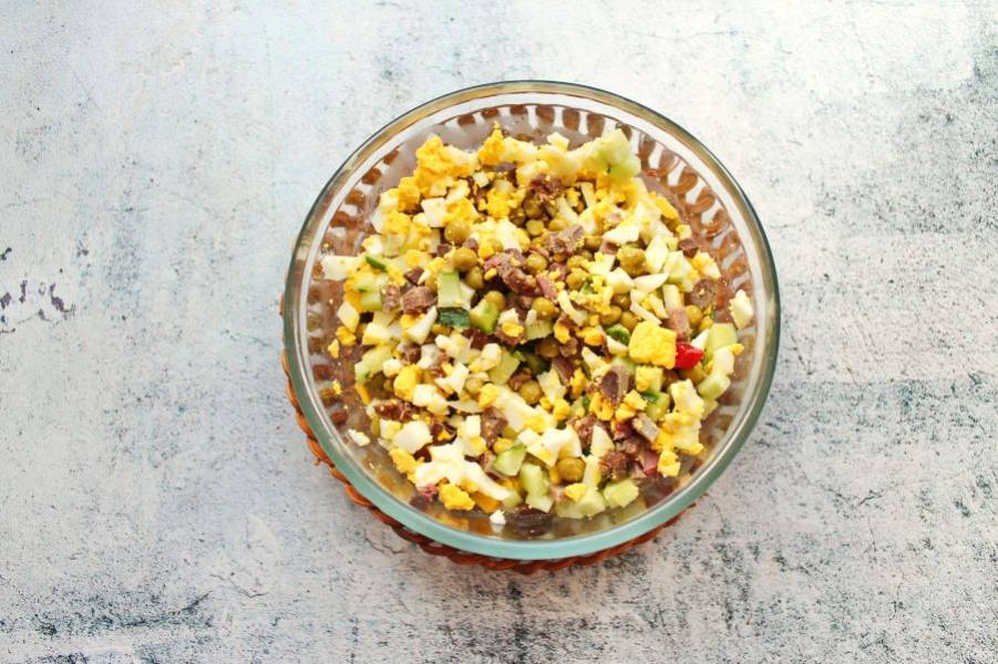 Яйца очистите, порежьте кубиком и добавьте в салат.