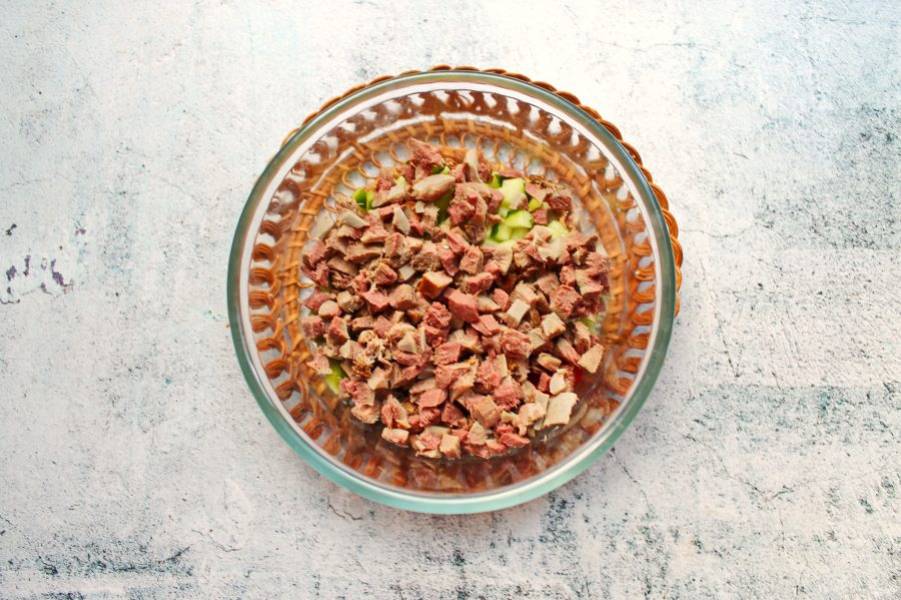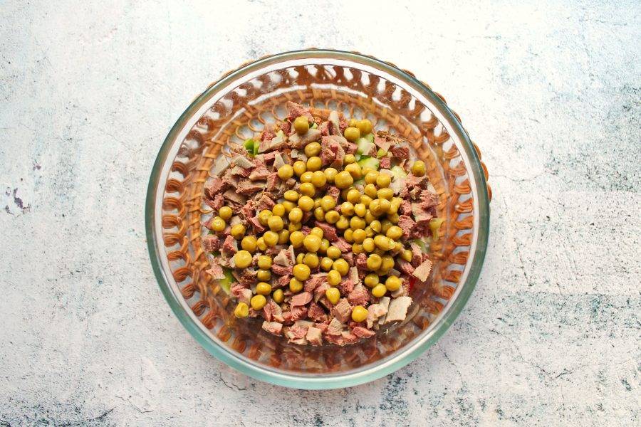 Отварной язык порежьте кубиком и добавьте к овощам.