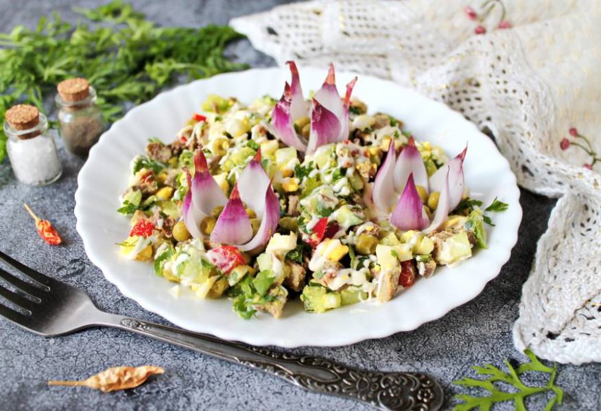 Салат посолите, заправьте майонезом и перемешайте. Переложите салат в сервировочное блюдо и украсьте лилиями. Для этого фиолетовый лук разрежьте на дольки вдоль и разделите на части. На салат выдавите немного майонеза и установите дольки лука как лепестки лилии. Сделайте несколько цветов, в серединку положите по несколько горошин.