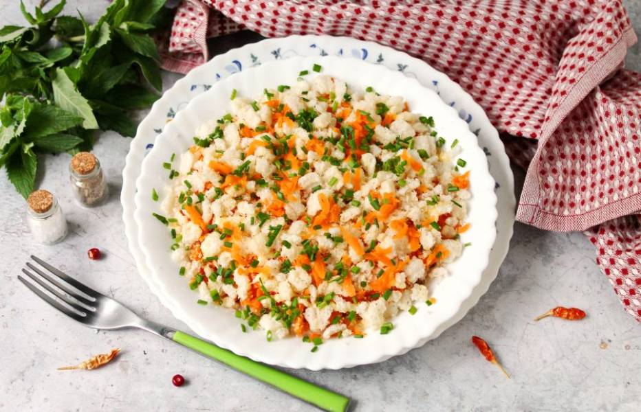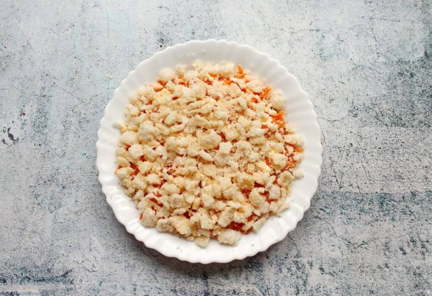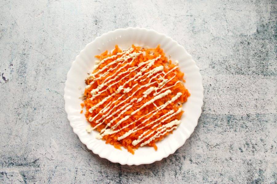Отварную морковь очистите, натрите на крупной терке и выложите ровным слоем на лук и курицу. Смажьте морковь майонезом.