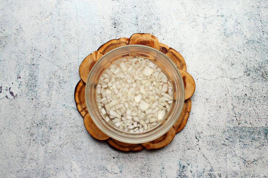 Репчатый лук почистите и мелко порежьте. Выложите лук в миску, залейте его водой с уксусом и оставьте на 10 минут.