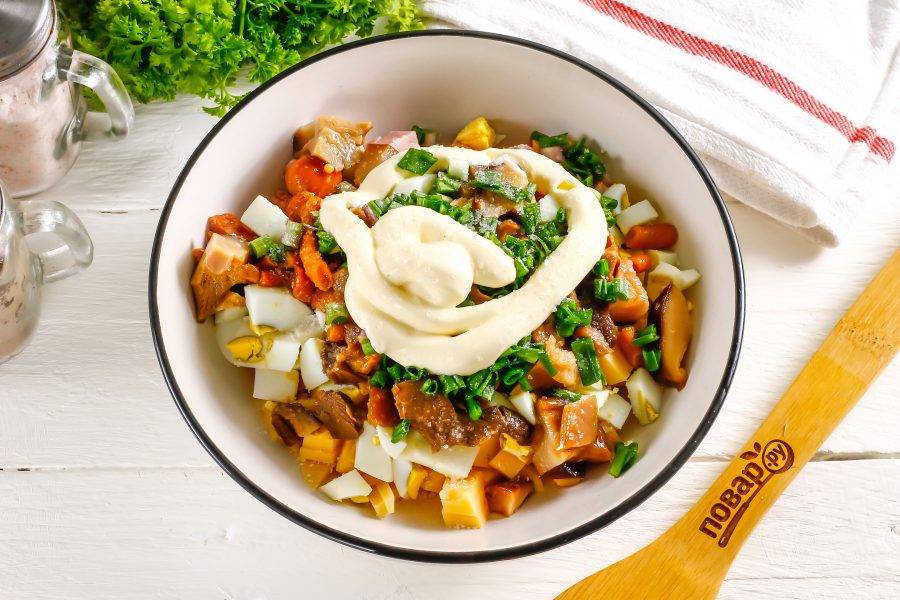 Добавьте майонез любой жирности, соль и аккуратно перемешайте салат.