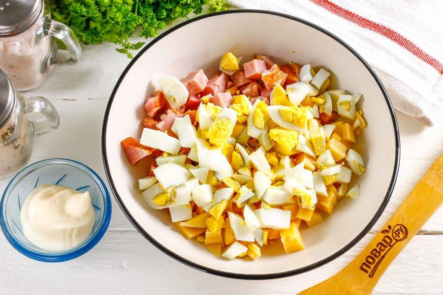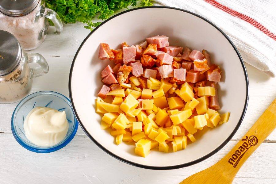 Ветчину нарежьте пластинами, а пластины - кубиками. Точно так же нарежьте твердый сыр, часть его оставляя для измельчения и украшения блюда. Отправьте обе нарезки в глубокую емкость.