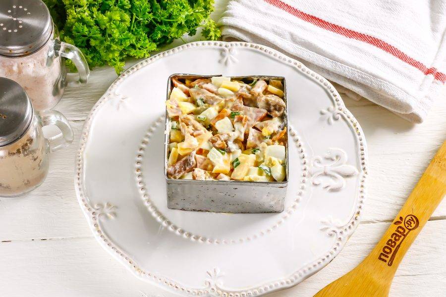 Выложите салат порционно через кулинарное кольцо или квадрат на тарелки.