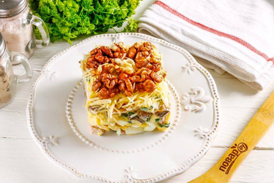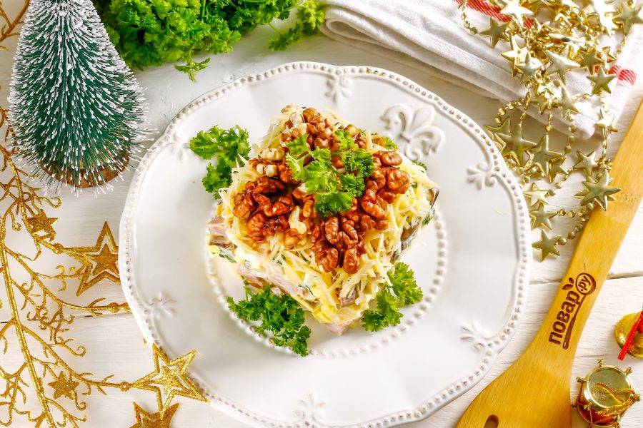 Натрите оставшийся твердый сыр на терке с мелкими ячейками, присыпьте сверху и украсьте ядрами грецких орехов, свежей зеленью.