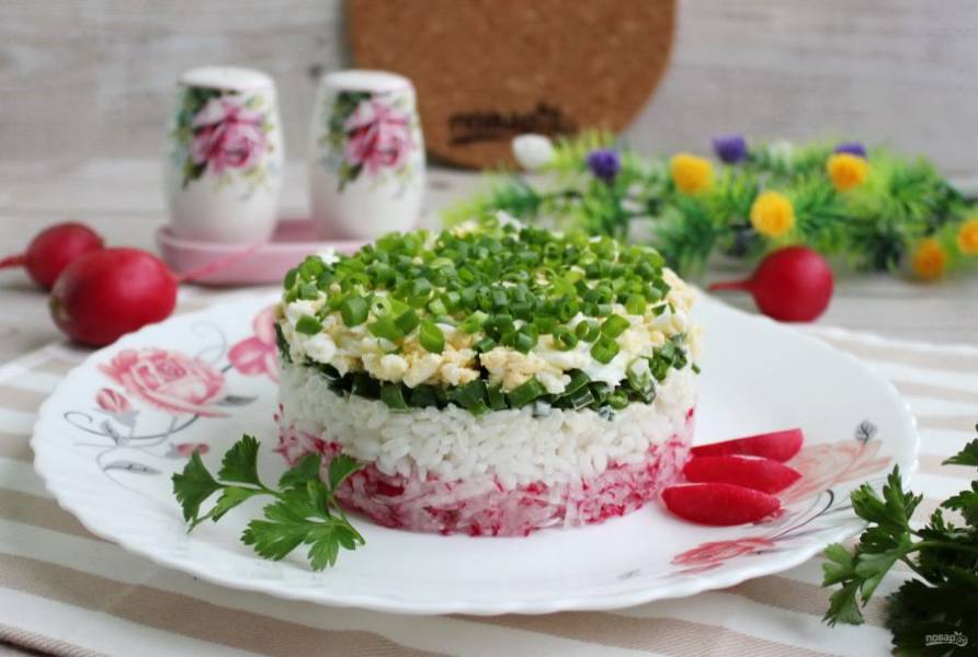 Предлагаю вашему вниманию вкусный, легкий и одновременно сытный салат без мяса и колбасы. В нем хорошо сочетаются редис, яйца, рис и зеленый лук. Такая закуска подойдет к столу в будни и не только.