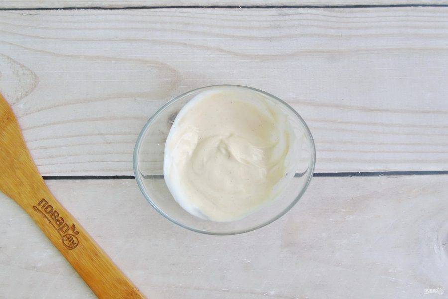 Приготовьте заправку. Сметану смешайте с горчицей и немного посолите по вкусу.