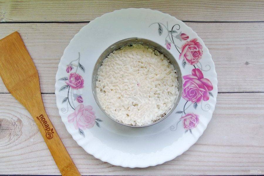 Отварной рис выложите вторым слоем и покройте заправкой.
