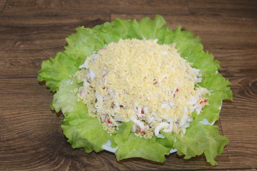 Отделите белки от желтков. Белки натрите на крупной тёрке.