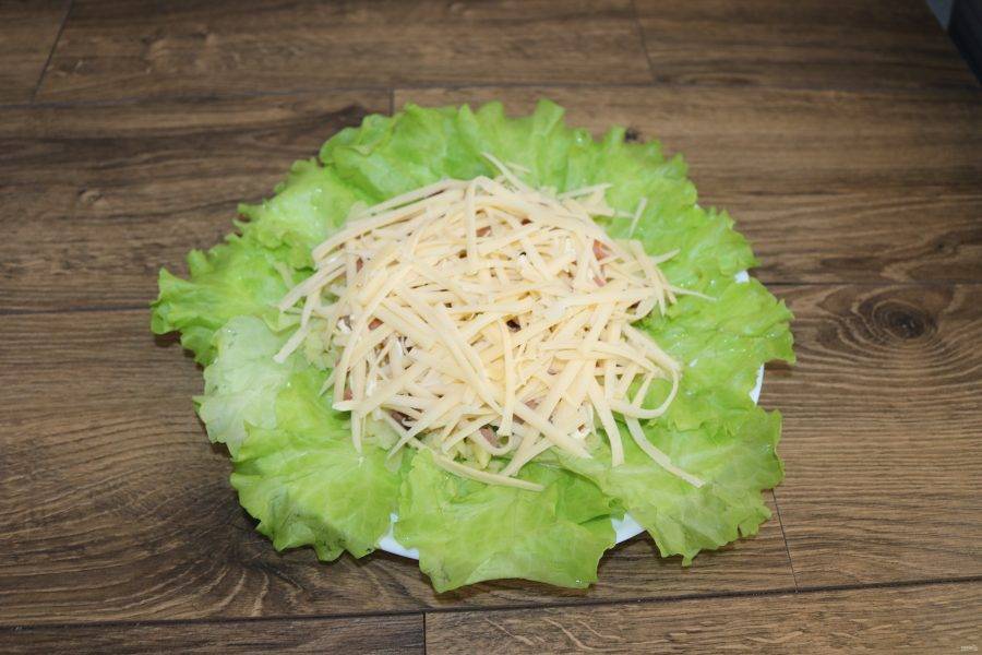 Затем натрите на крупной тёрке сыр и сделайте сеточку майонеза.
