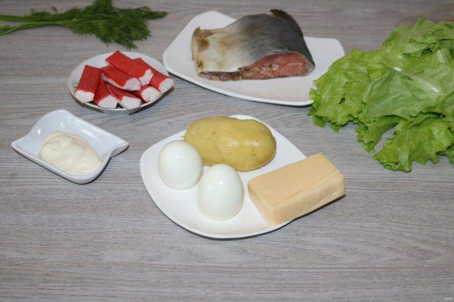 Крабовые палочки и рыбу нарежьте мелкими кубиками. Несколько кусочков рыбы оставьте для украшения.