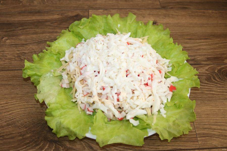 Затем выложите нарезанные крабовые палочки, посыпьте мелко нарезанным укропом, сделайте сеточку майонеза.