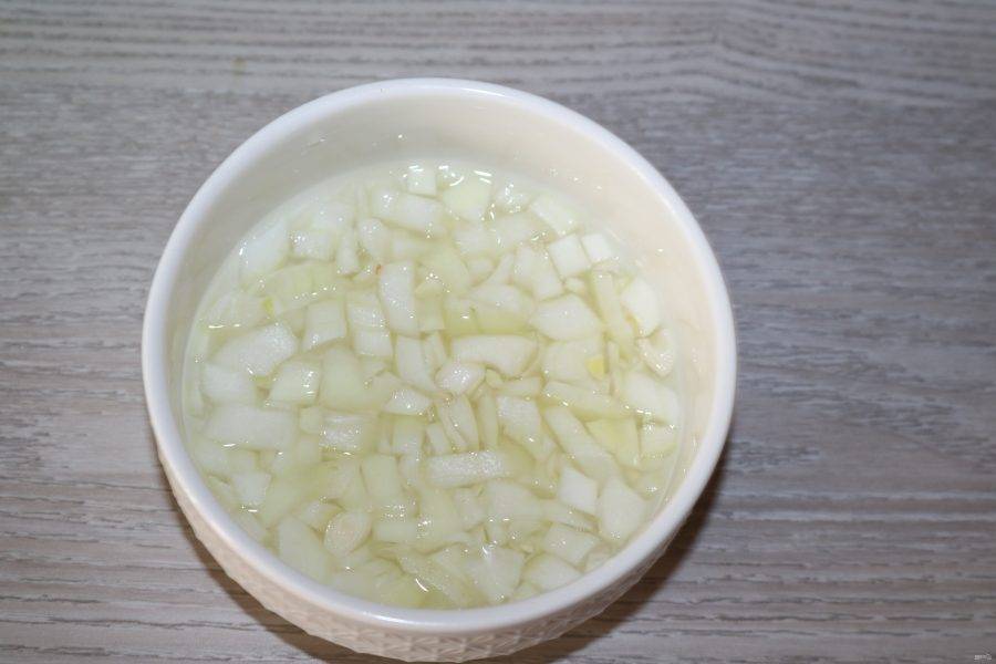 Лук нарежьте мелкими кубиками и замаринуйте в небольшом количестве уксуса и воды.