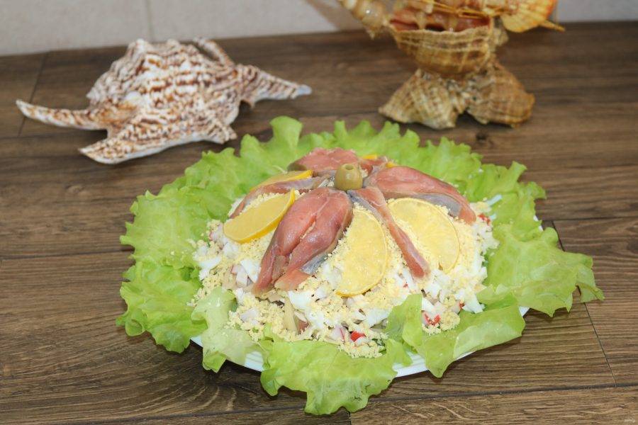 Украсьте верх салата кусочками рыбы и ломтиками лимона.