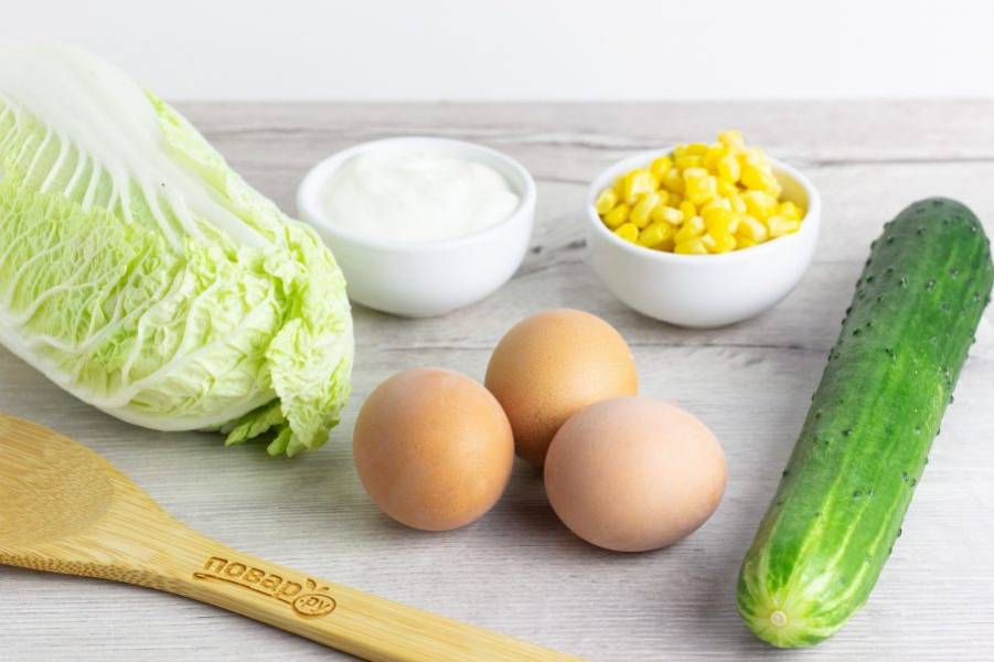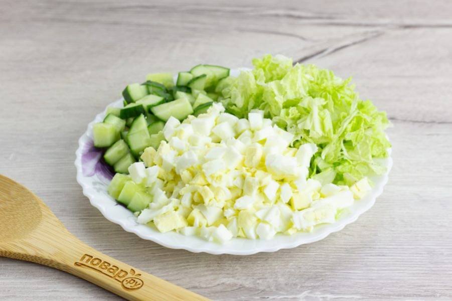 Овощи помойте и обсушите, яйца очистите. Нарежьте кубиком яйца и огурец. Капусту нарежьте произвольно, но не очень крупно.