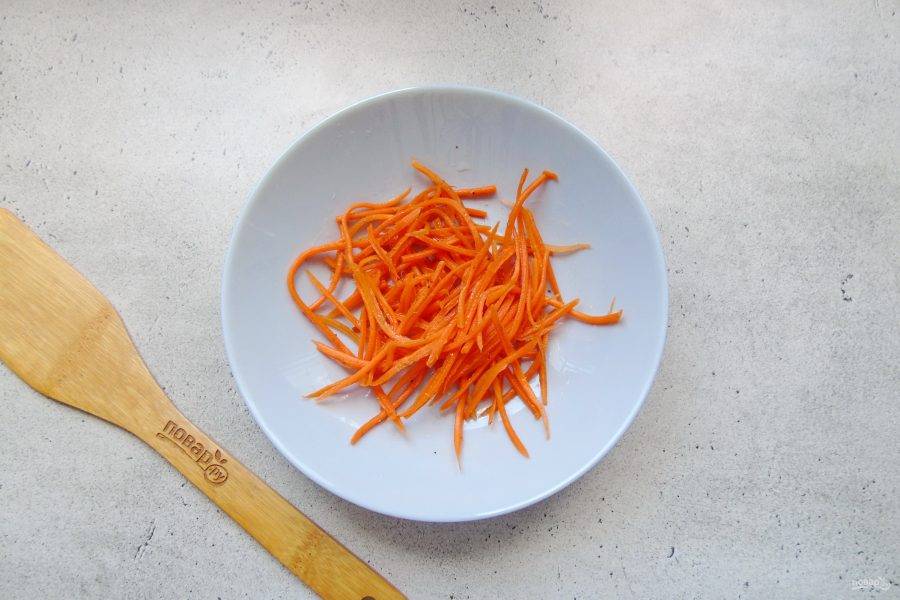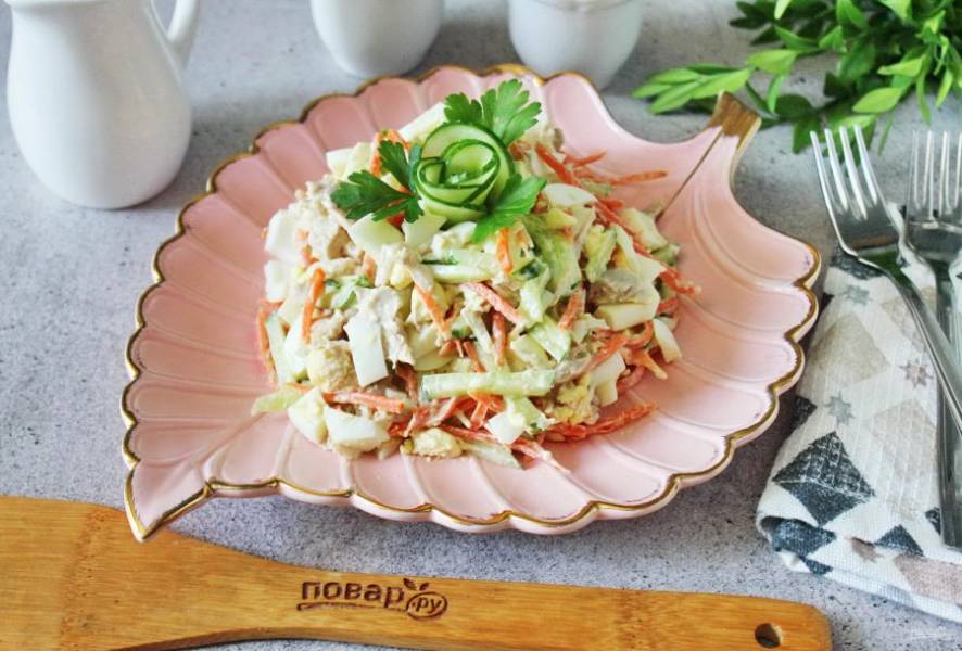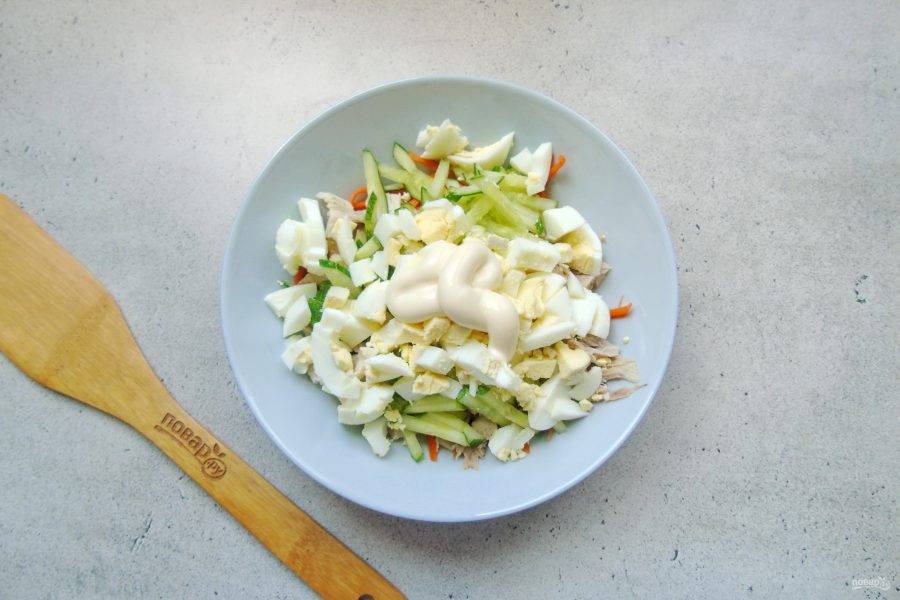 Салат заправьте небольшим количеством майонеза, посолите, поперчите.