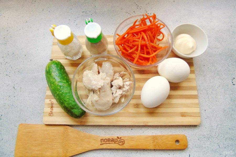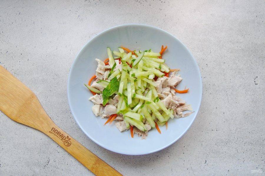 Свежий огурец помойте, нарежьте и выложите в салат.