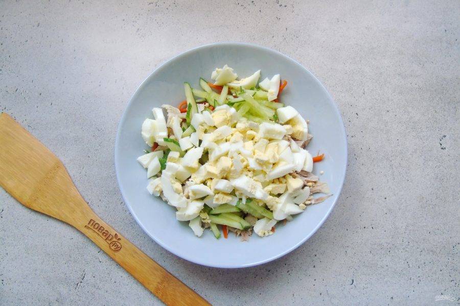 Яйца сварите вкрутую, охладите, очистите и нарежьте.
