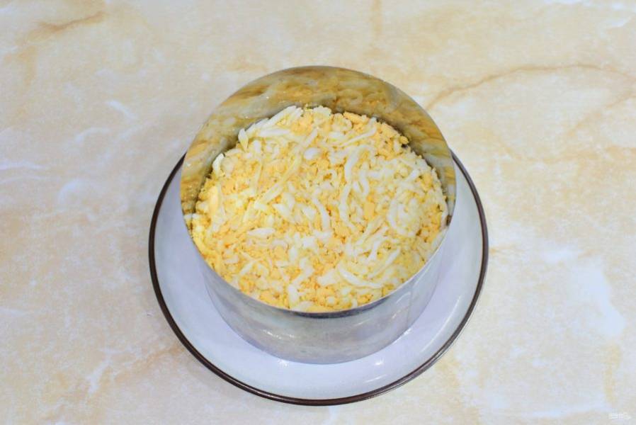 Потрите яйца на терке и выложите из них следующий слой.