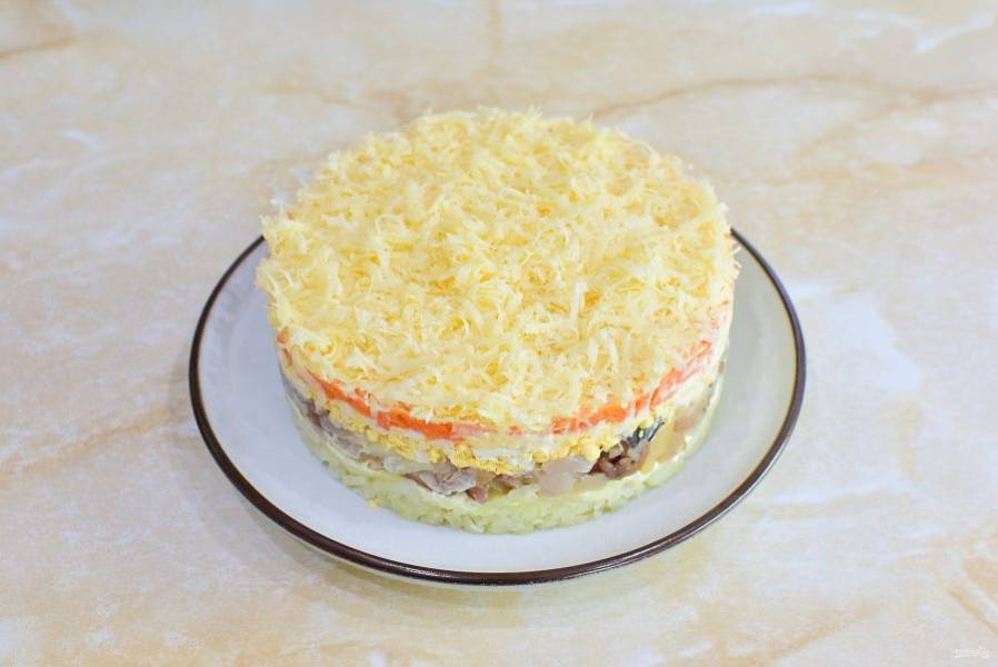 Последним слоем выложите тертый сыр и аккуратно снимите сервировочное кольцо. Готовый салат немного охладите перед подачей и украсьте на свой вкус.
