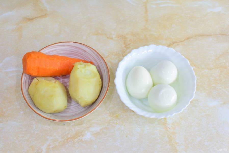 Очистите отварной картофель и морковь от кожуры. Очистите яйца от скорлупы.