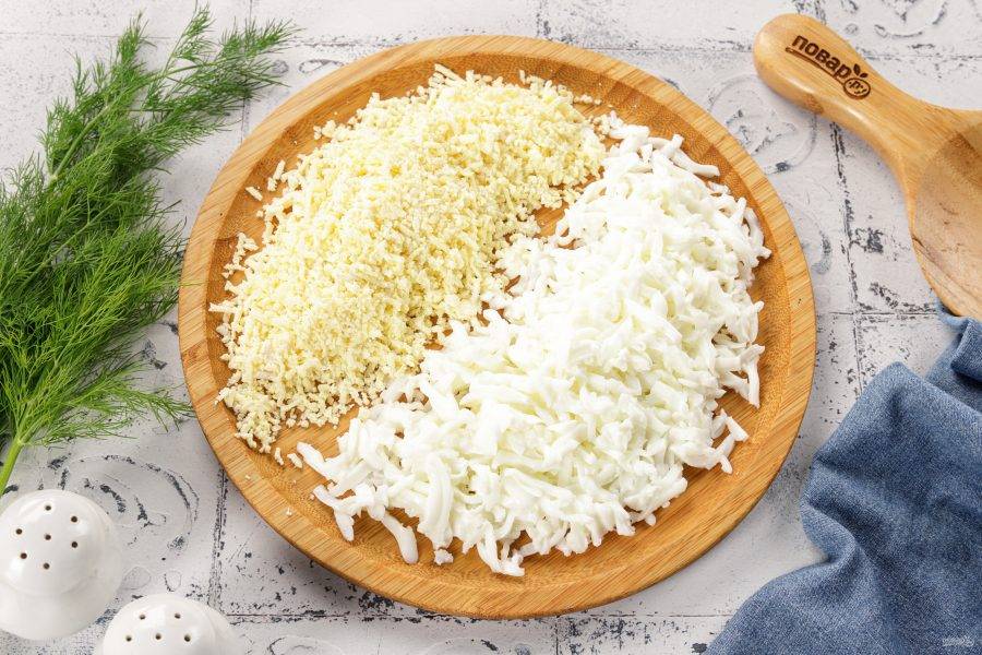 Отварные яйца очистите от скорлупы и разделите на желток и белок. Желтки натрите на мелкой тёрке, а белки на тёрке с крупными отверстиями.