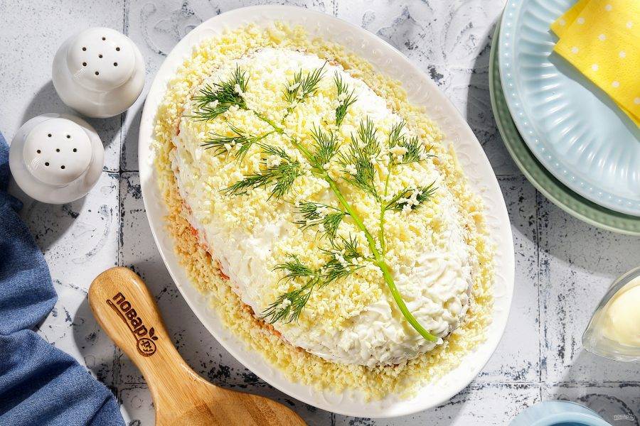 По центру можно украсить салат веточкой укропа и желтком. Делать такое украшение не обязательно. Можете просто промазать слой с яичными белками майонезом и вложить заключительным слоем натёртые на мелкой тёрке желтки. Перед подачей салат должен постоять в холодильнике, чтобы слои пропитались майонезом, и он не казался сухим. Приятного аппетита!