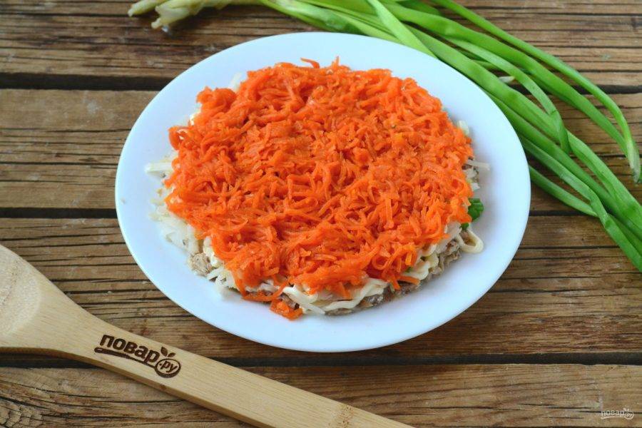 Морковь натрите на мелкой терке и выложите следующим слоем и также промажьте майонезом.