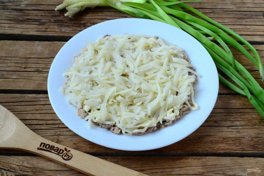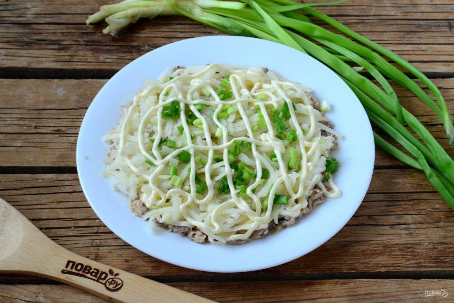 Зеленый лук (его можно заменить на репчатый лук) мелко порубите и выложите на картофель. Сверху смажьте майонезом (обратите внимание – картофель мы не смазывали майонезом).