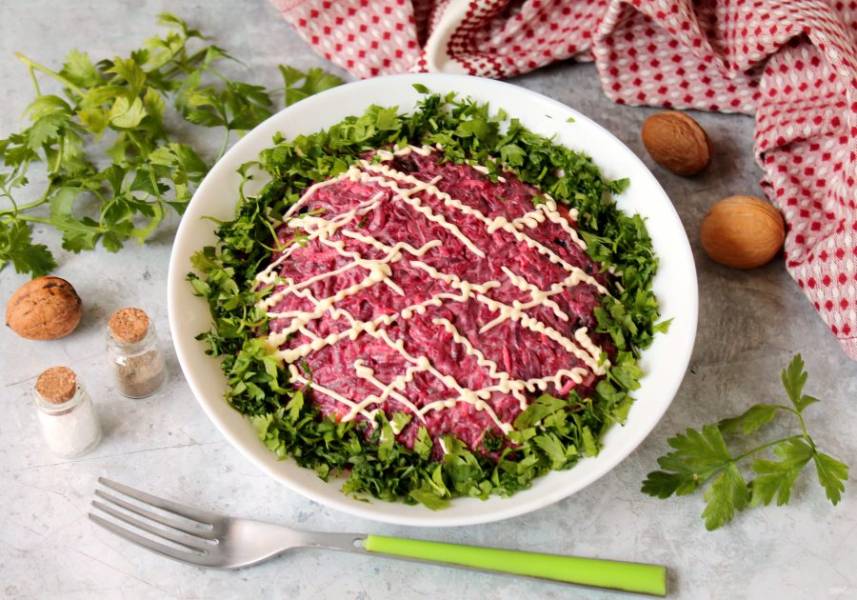 Сверху выложите оставшуюся свеклу, закрывая бока. Украсьте мелко нарезанной зеленью и подавайте к столу.