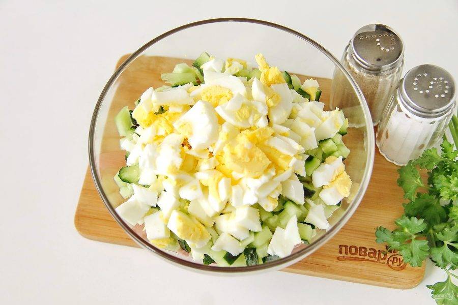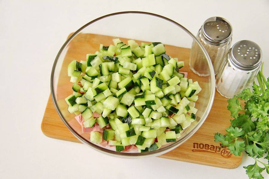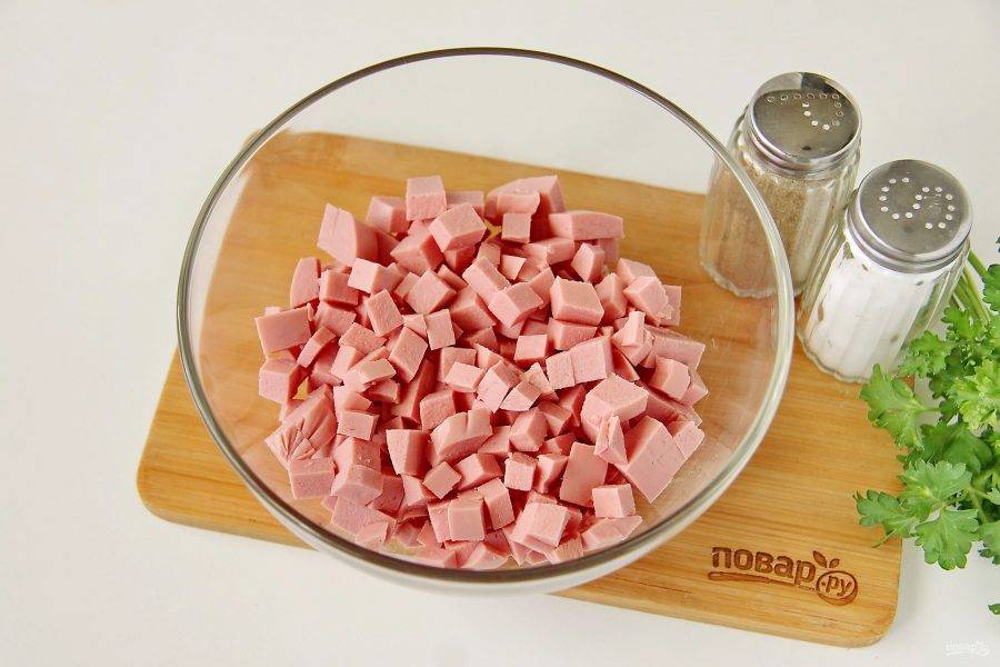 Колбасу нарежьте небольшими кубиками и переложите в глубокий салатник.