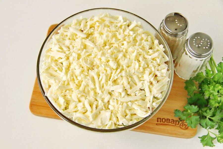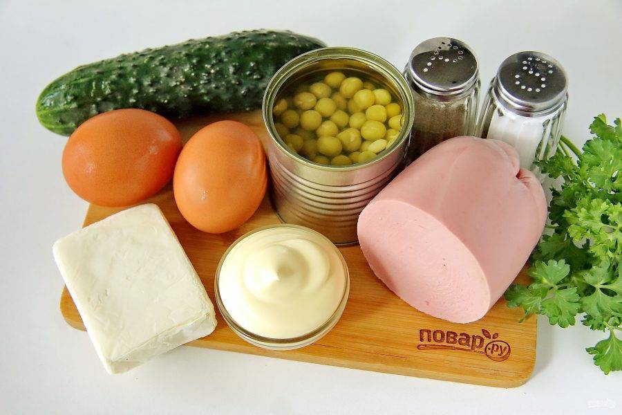 Разровняйте салат ложкой и посыпьте тертым на крупной терке плавленым сыром. Чтобы удобнее это было сделать, отправьте сырок предварительно в морозилку на 30 минут. Вот и все. Салат из вареной колбасы готов. Можно подавать его сразу на стол, а можно символично украсить в честь Нового Года.