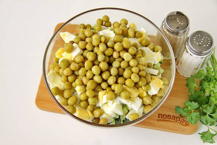 Добавьте сюда же горошек, предварительно слив с него всю жидкость.