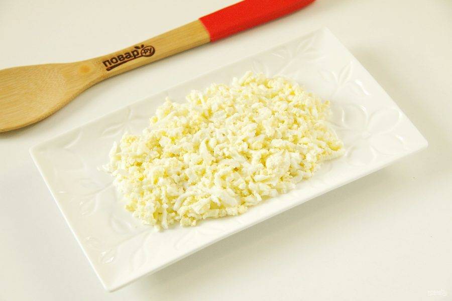 Делим все ингредиенты на две части и начинаем укладывать салат слоями, каждый слой промазываем майонезом и подсаливаем по вкусу. Первый слоем положите тертые яйца.