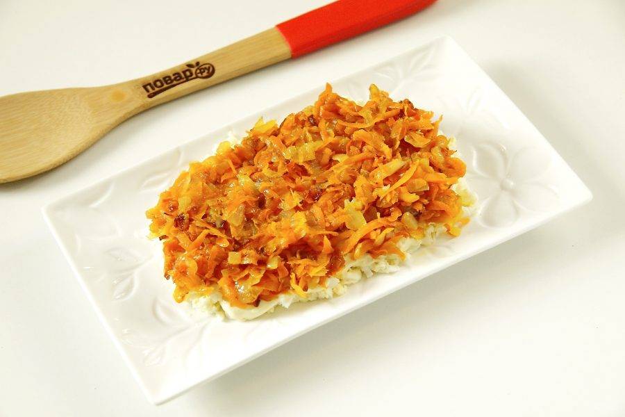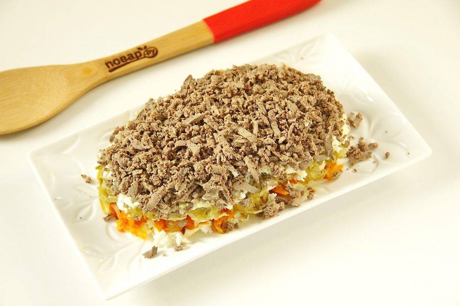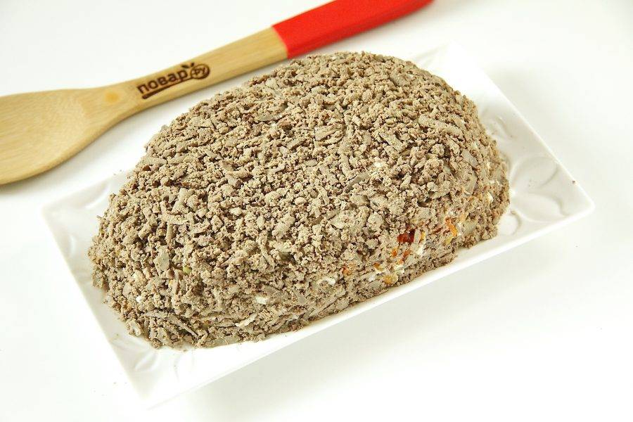 Повторите слои еще раз. Сверху у вас должен быть слой печени. Распределите ее не только сверху, но и со всех боков, придавая салату нужную форму.