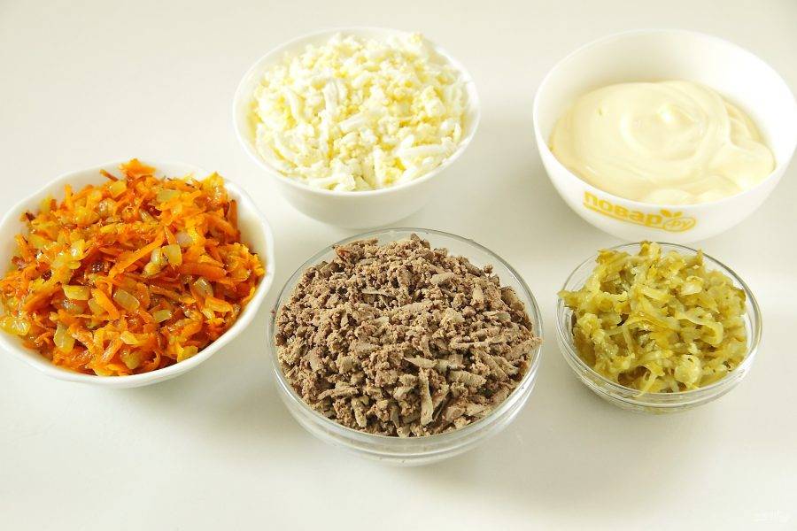 Лук с морковью обжарьте. Огурцы натрите на крупной терке и отожмите. Очищенные яйца и печень также натрите на крупной терке.