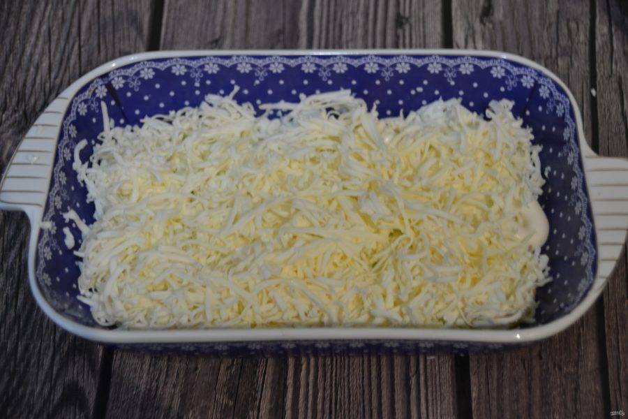 Шестой слой - майонез и измельченный на терке яичный желток.