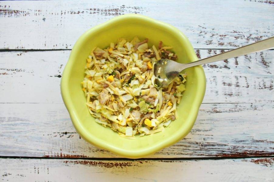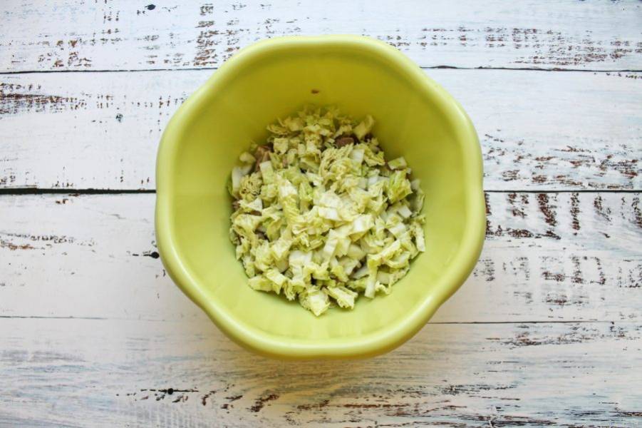 Листья пекинской капусты порежьте кубиком и добавьте в салат.