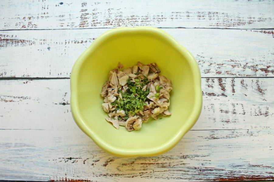 У отварной курицы удалите кожу и кости и порежьте кубиком, выложите в миску. Добавьте к курице мелко нарезанную зелень.