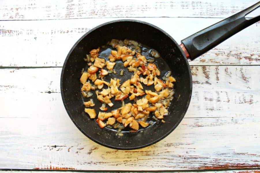 Репчатый лук почистите и мелко порежьте. В сковороду налейте растительное масло, добавьте порезанные лук и грибы. Обжаривайте все на среднем огне в течение 10 минут, перемешивая, снимите с огня и остудите.