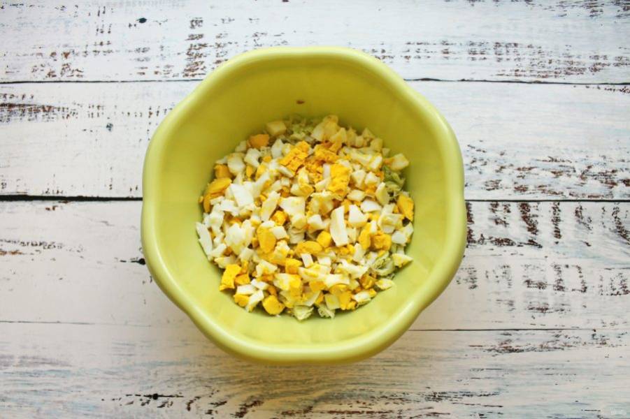 Отварные яйца очистите, порежьте кубиком и добавьте в миску с салатом.