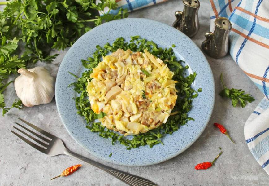 Салат посолите, заправьте майонезом, перемешайте и сразу подавайте к столу.